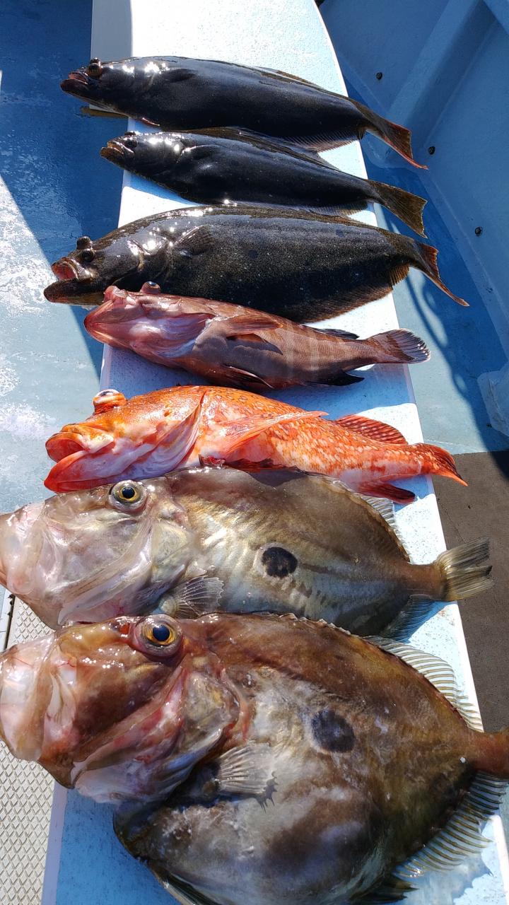 ヒラメの0.7~1.3キロを1~2枚。他にカサゴ、ハタ、マトウダイ。水色濁り1日を通してアタリ少なかったです。