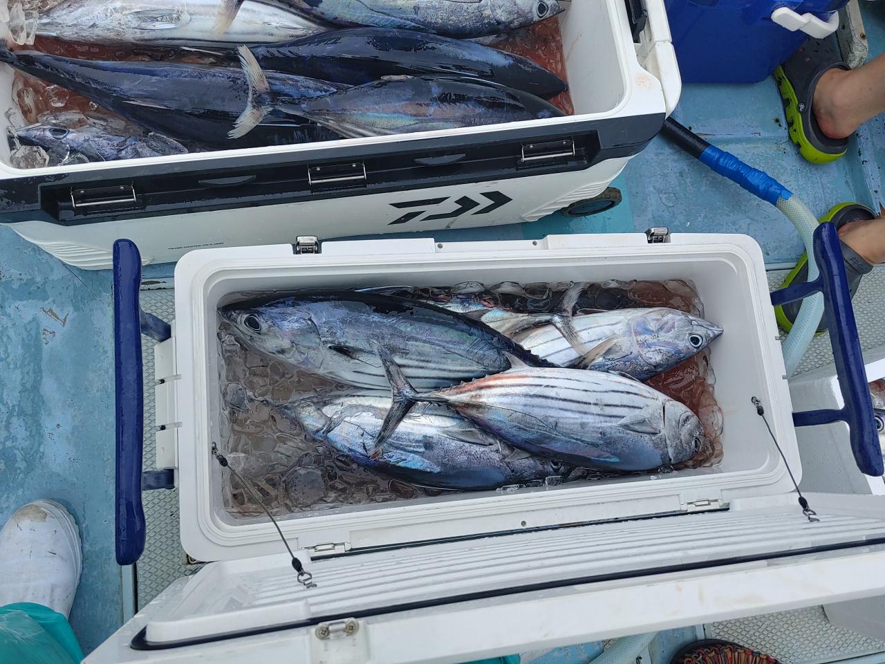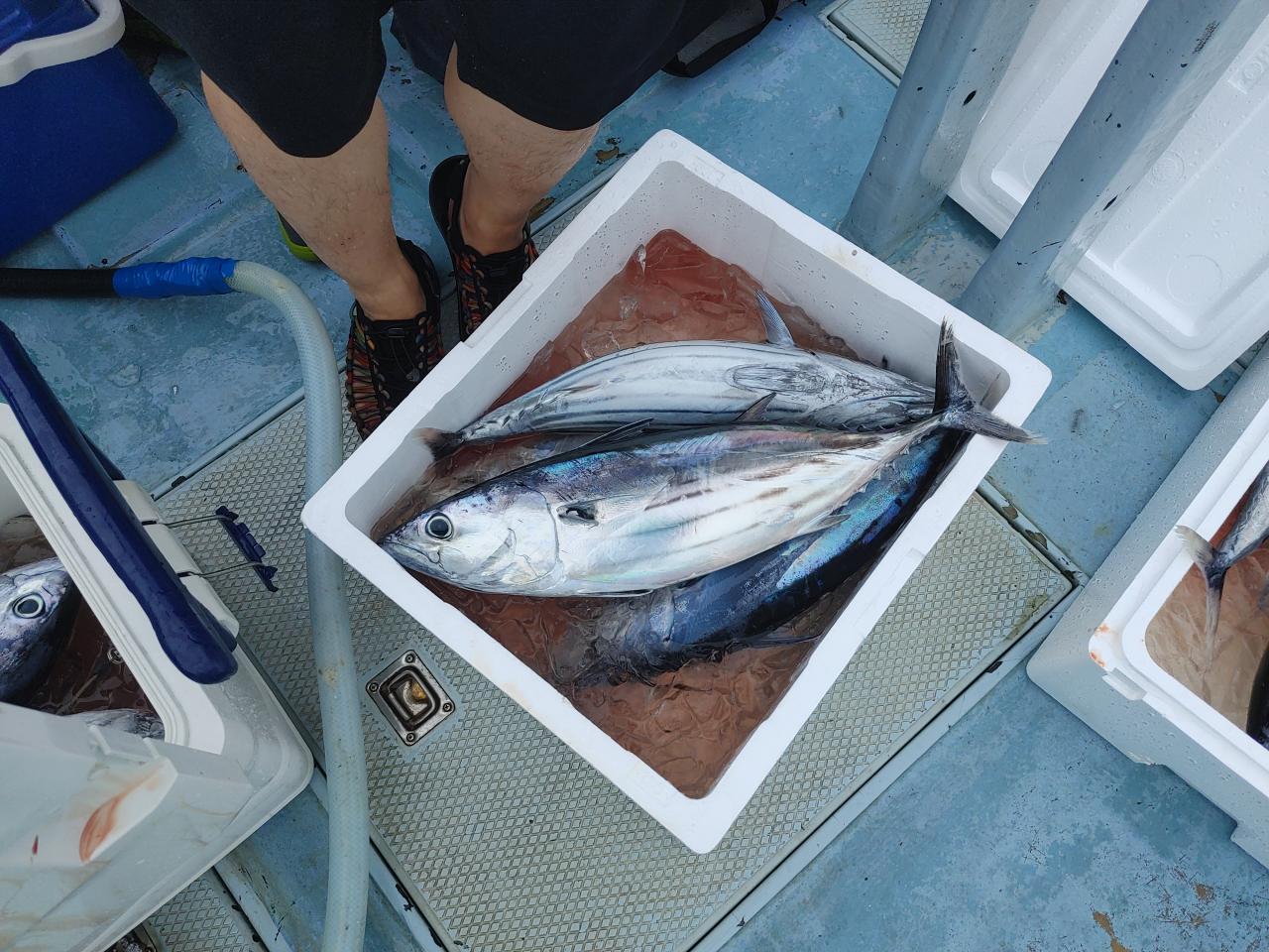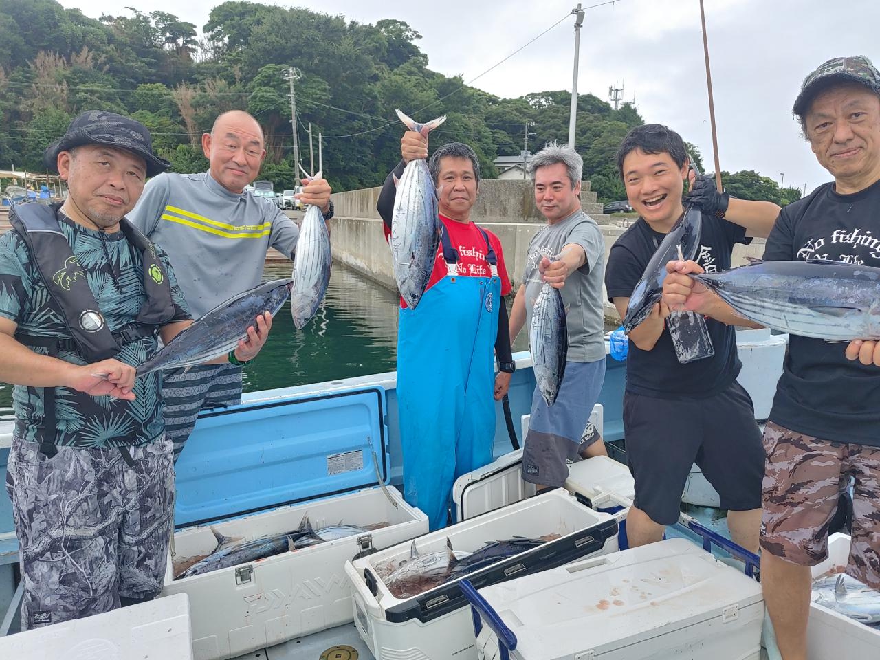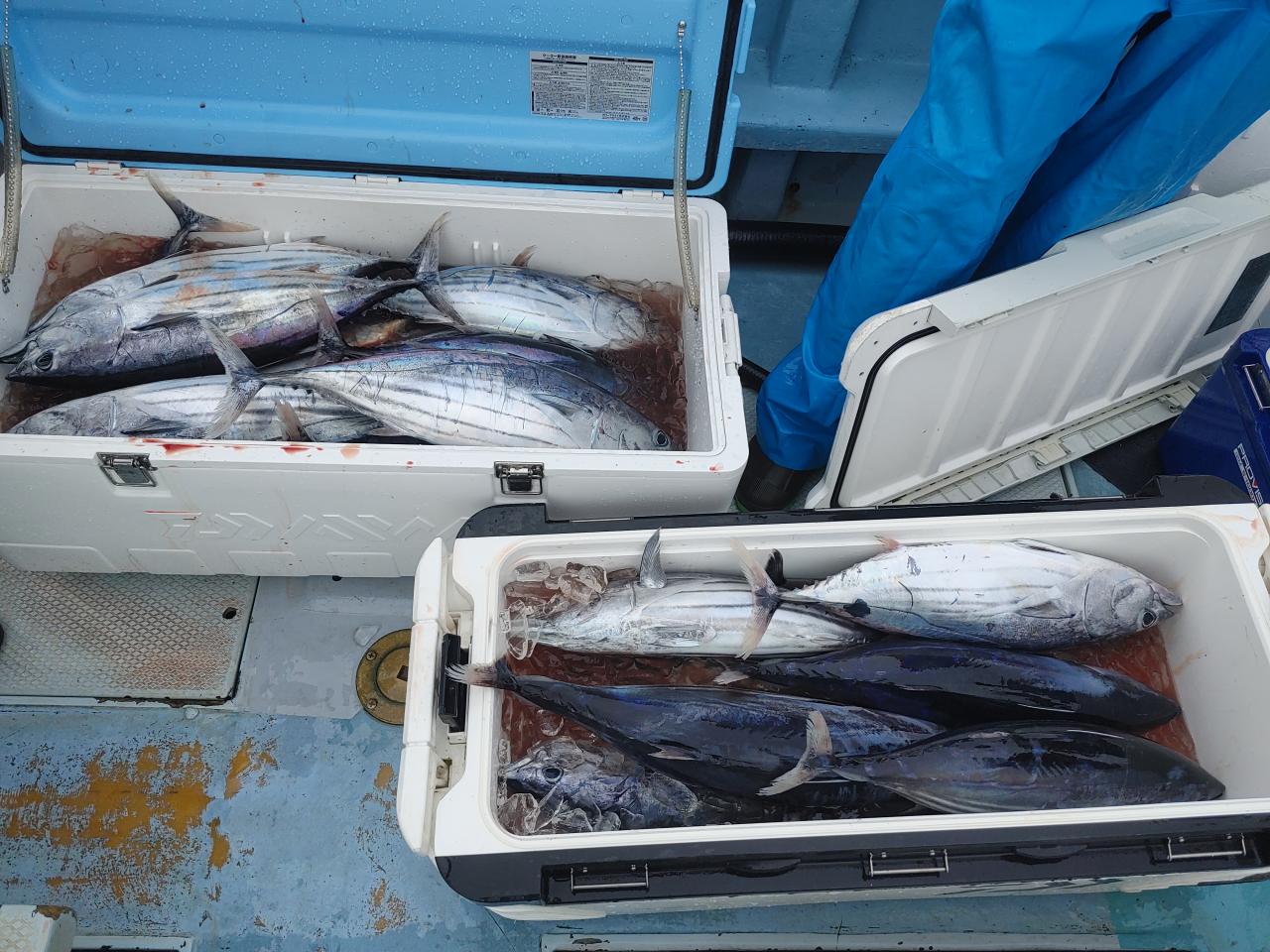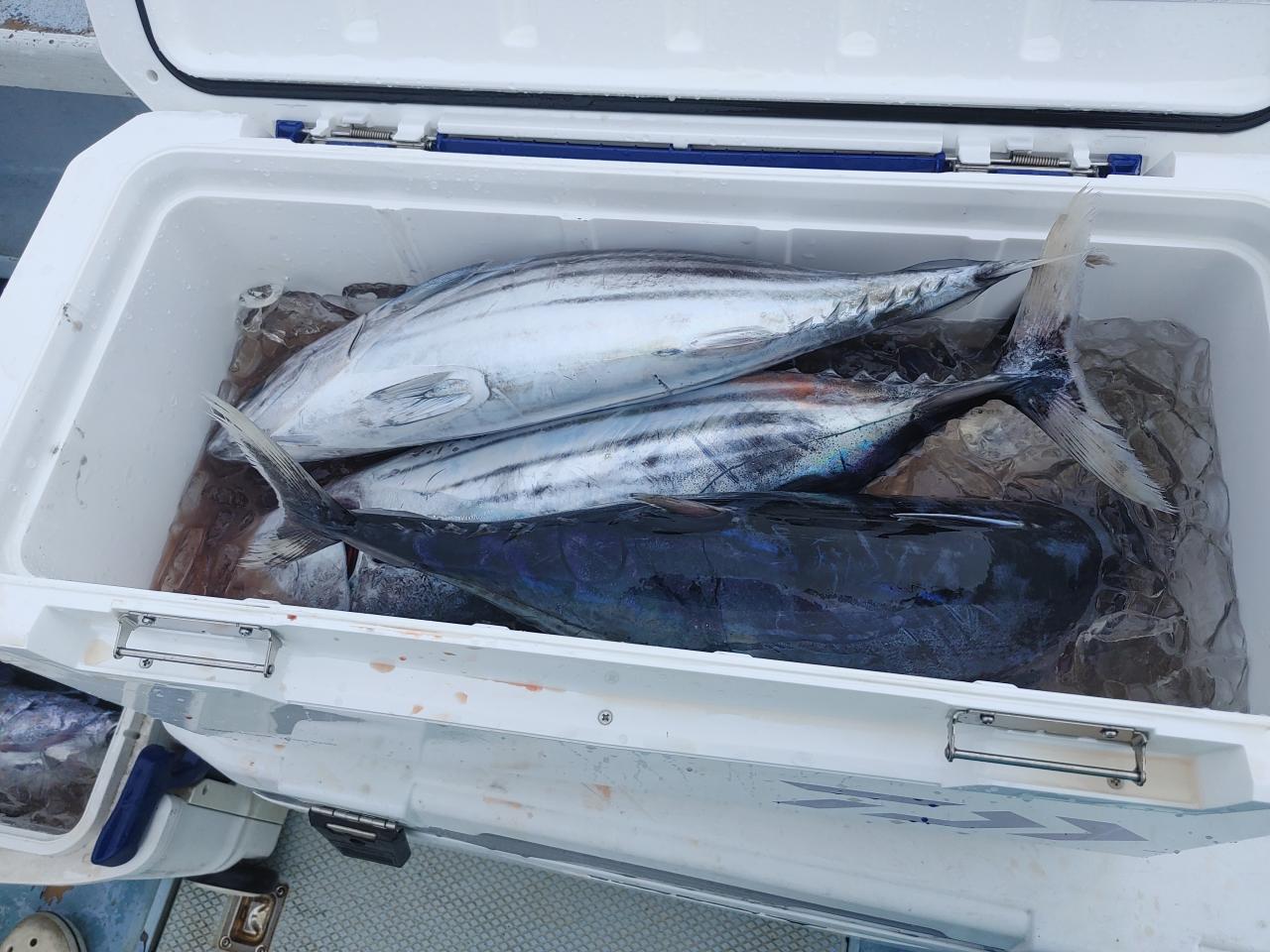 朝イチから良い群れ見付かりカツオの2〜4キロをクーラー満タン。他にキメジの3キロ。10時早上がり。2流しで終了。バリ食いでした。本日は乗船ありがとうございました。